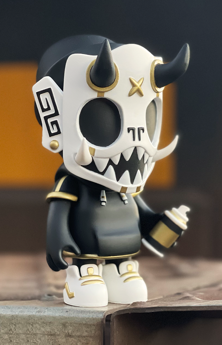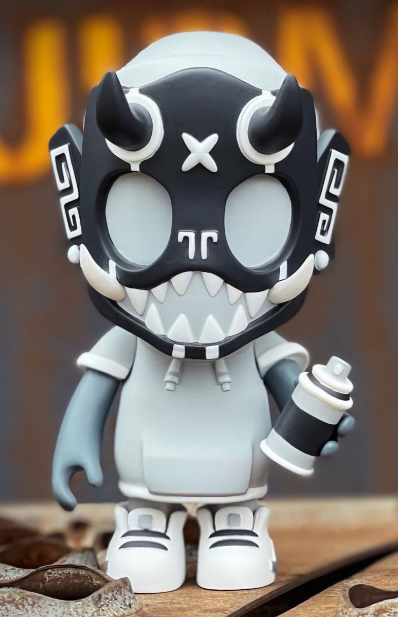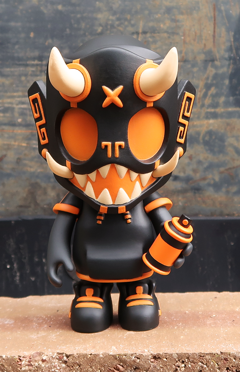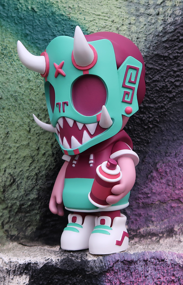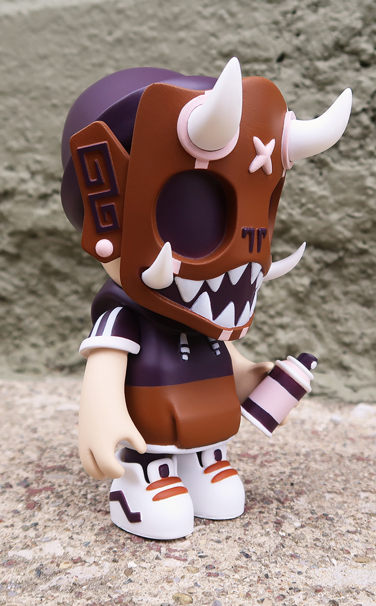 Our second round of toys introduced this skater dokkaebi. Each one of these vinyl toys stands 8” tall, comes with a unique sticker pack to customize their skate decks and was limited tof 100pcs.