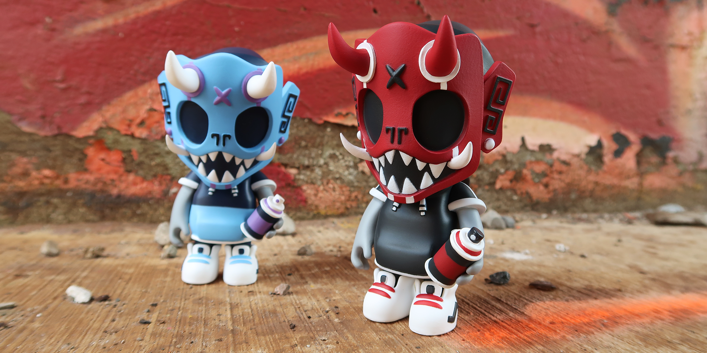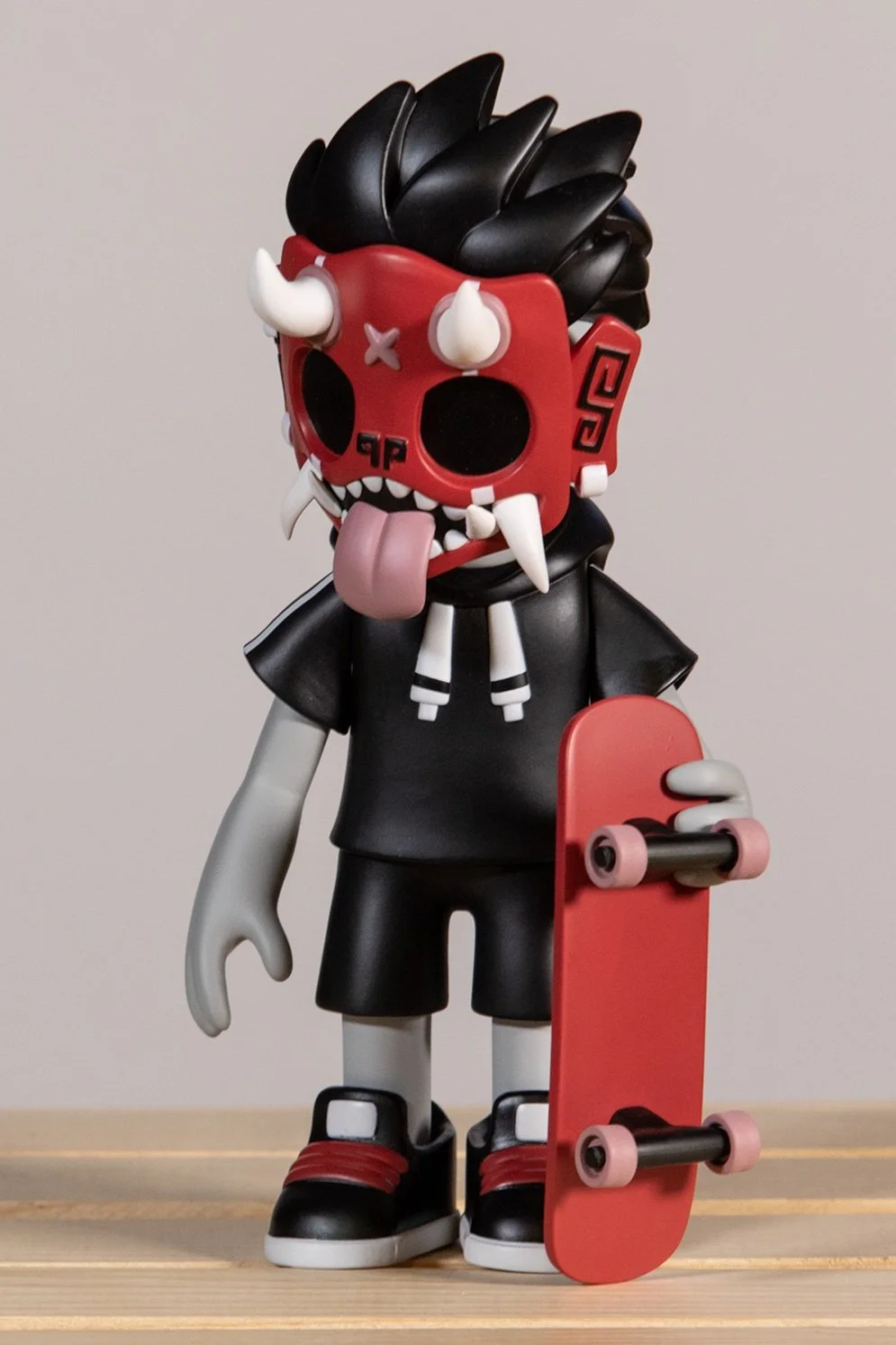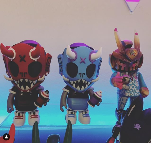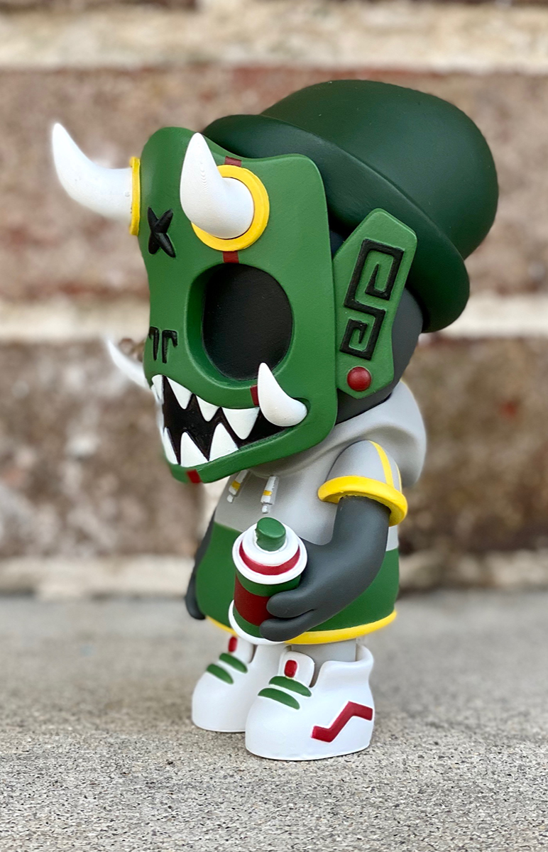 Our second round of toys introduced this skater dokkaebi. Each one of these vinyl toys stands 8” tall, comes with a unique sticker pack to customize their skate decks and was limited tof 100pcs.