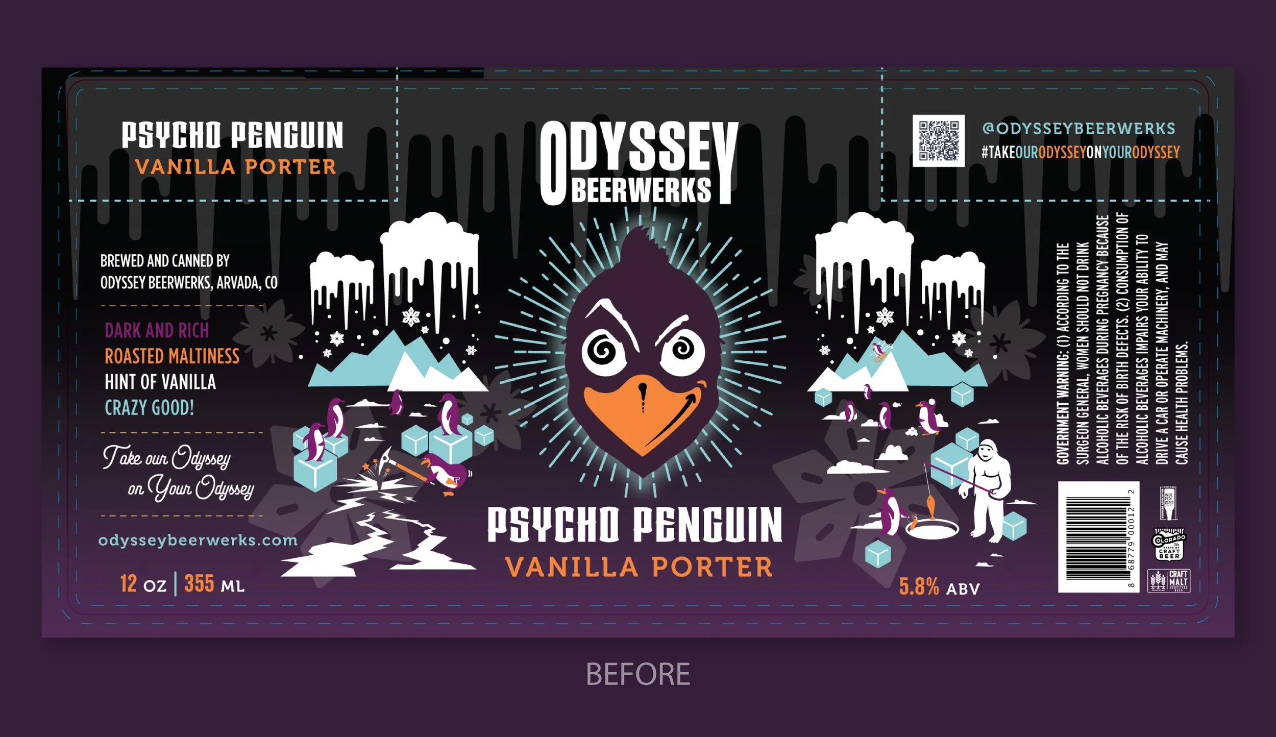 As with Ghost Drifter, the goal for Psycho Penguin was to simplify the design by removing excess detail and redefining the visual hierarchy to highlight a single, central illustration. Odyssey emphasized that the penguin should appear mischievous and wild—but not evil. Since this is one of their most popular beers, we went through an extensive ideation process (see images below) before arriving at the final design: a playful penguin rendered in a classic, vintage cartoon style.