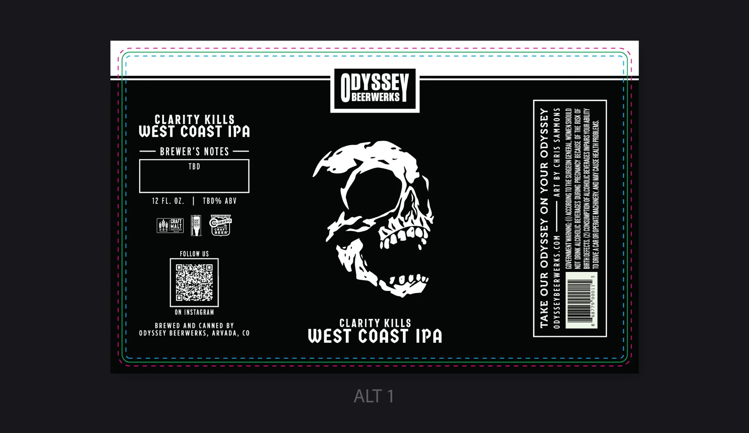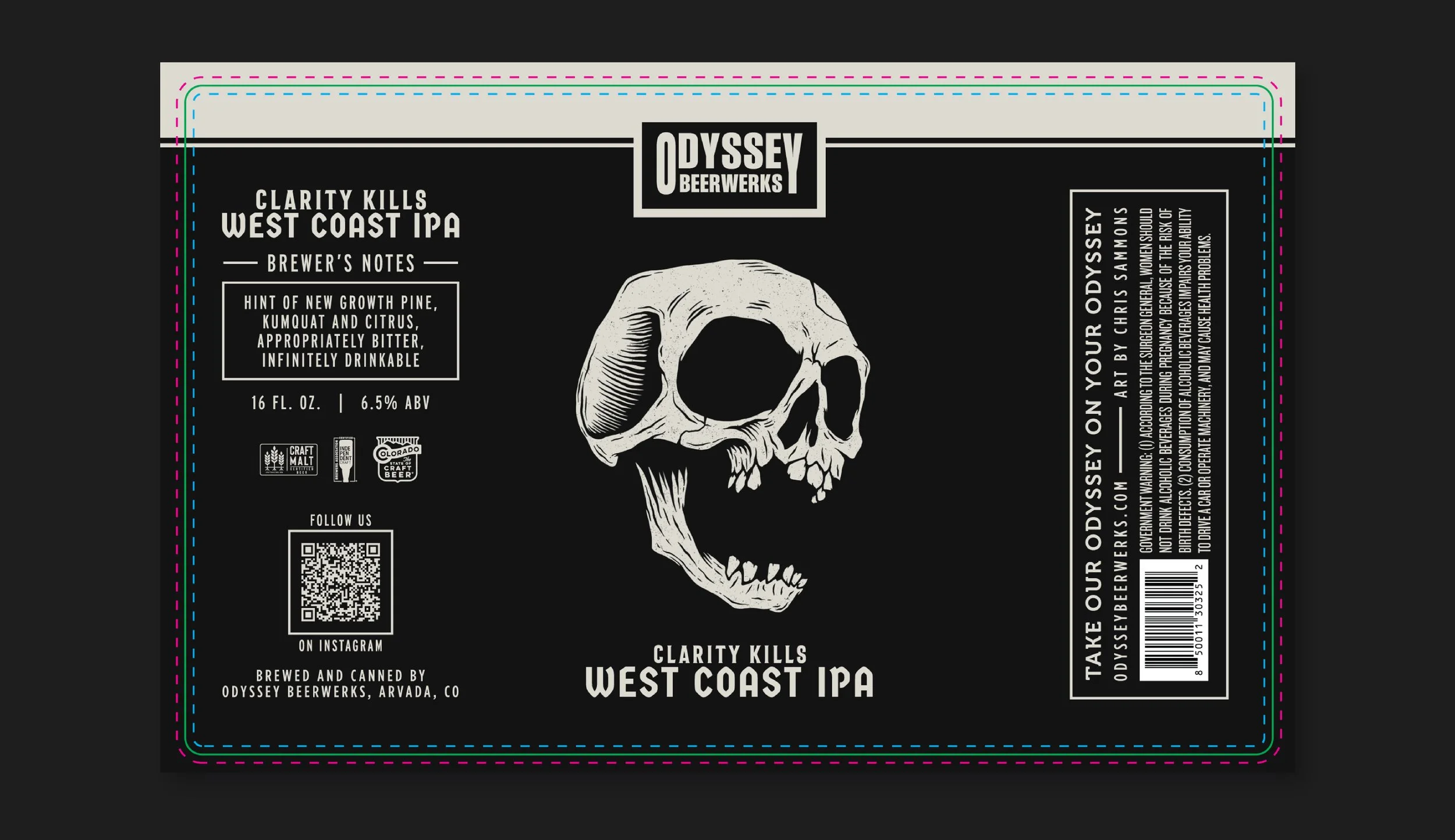 Clarity Kills is a new West Coast IPA introduced to replace a retired core product. For this label, Odyssey had a distinct vision: something that stood apart from the rest of their lineup. They wanted a single, striking skull—dark, metal-inspired, and unapologetically grim.