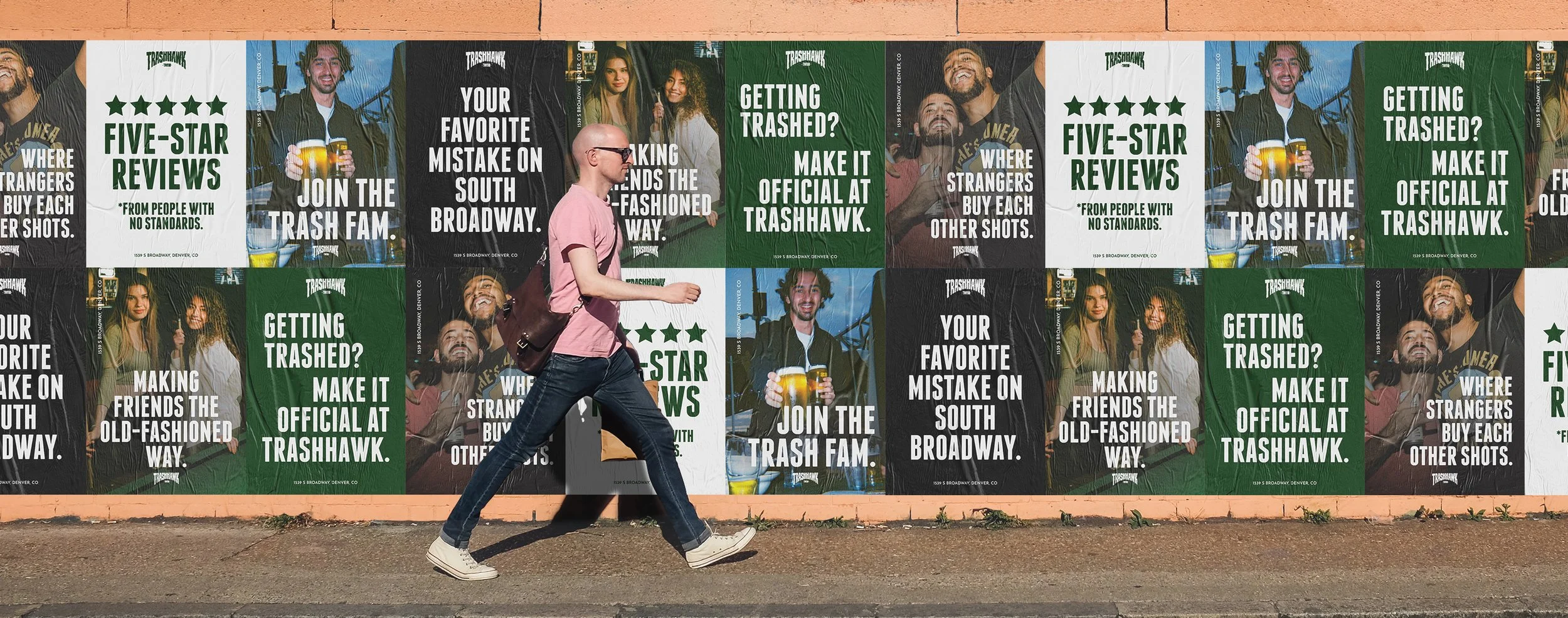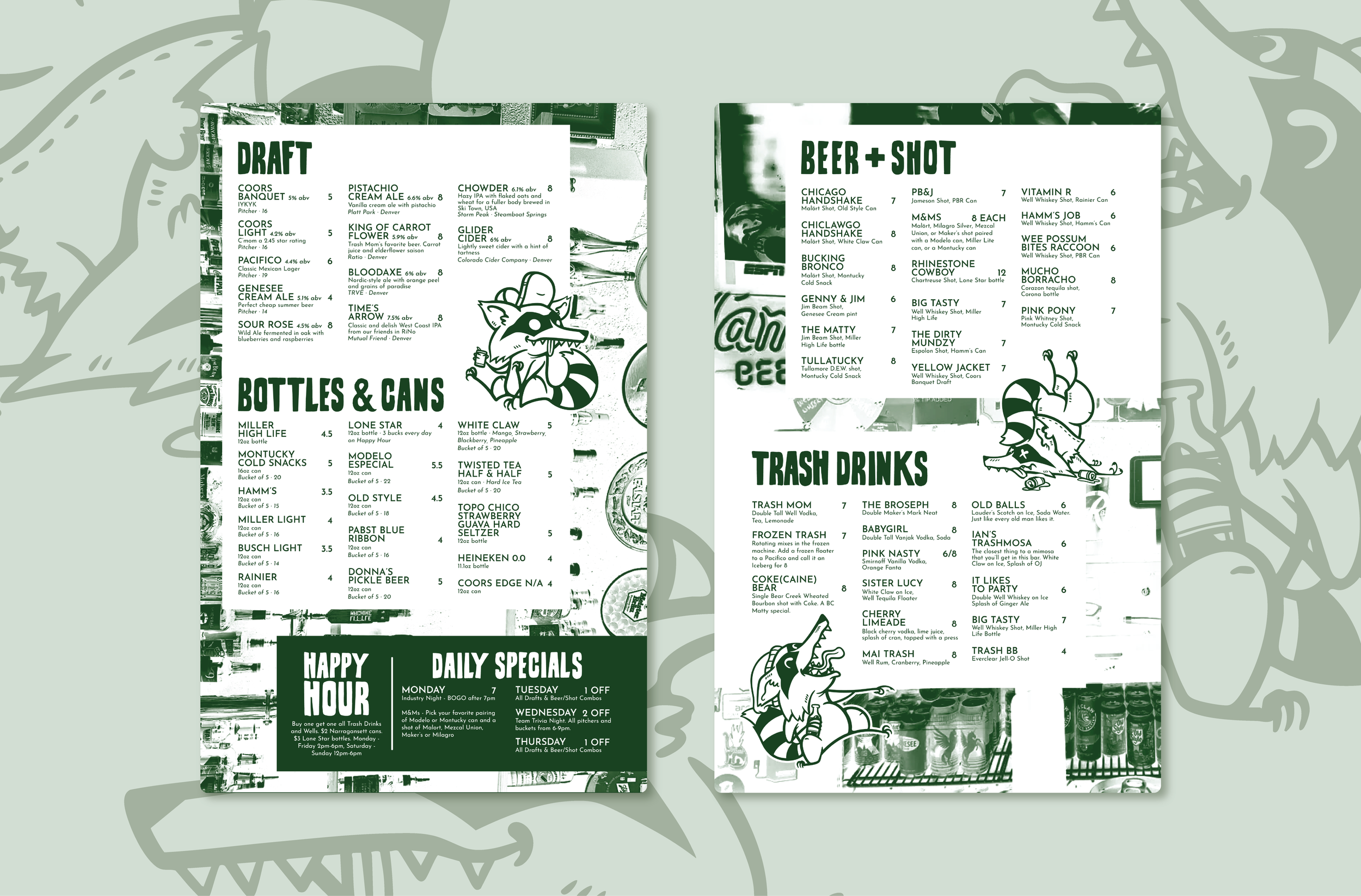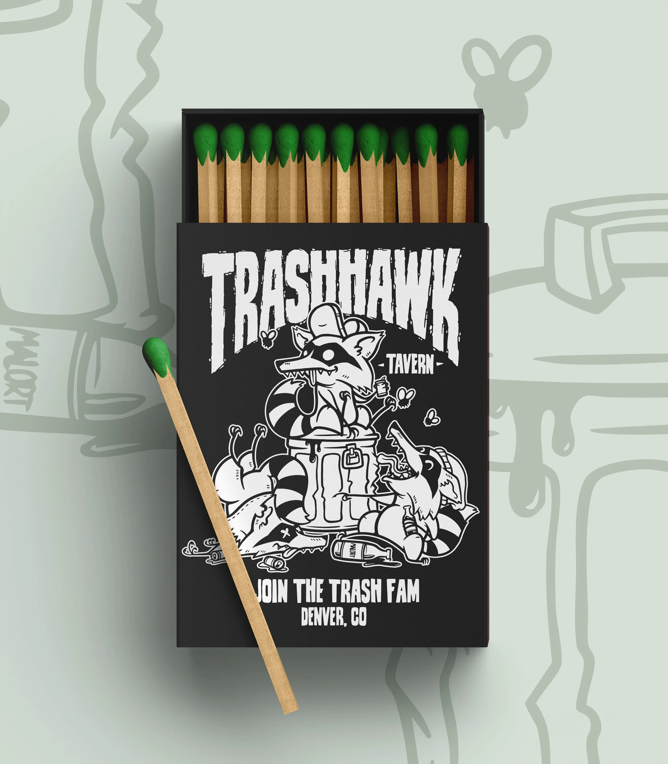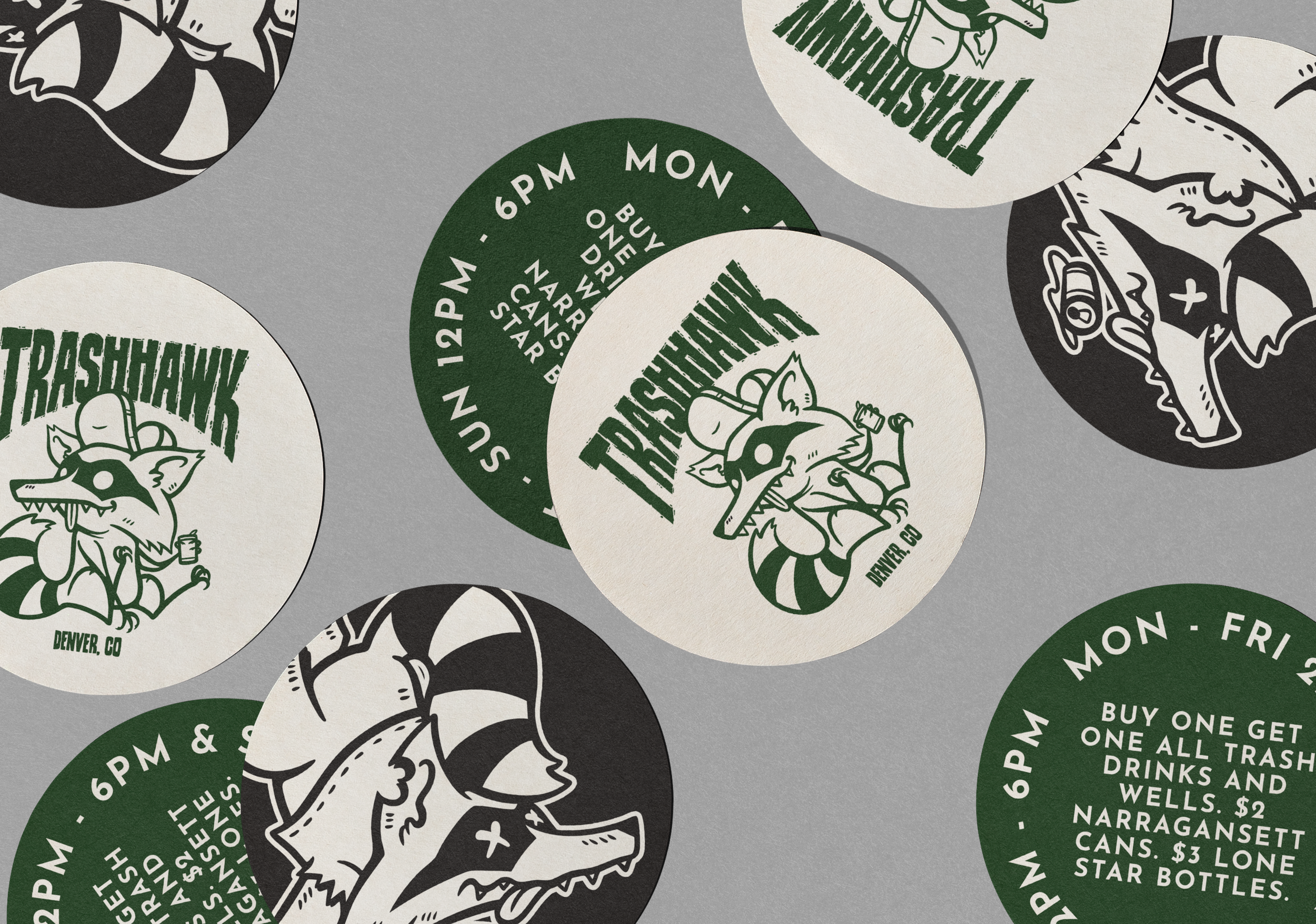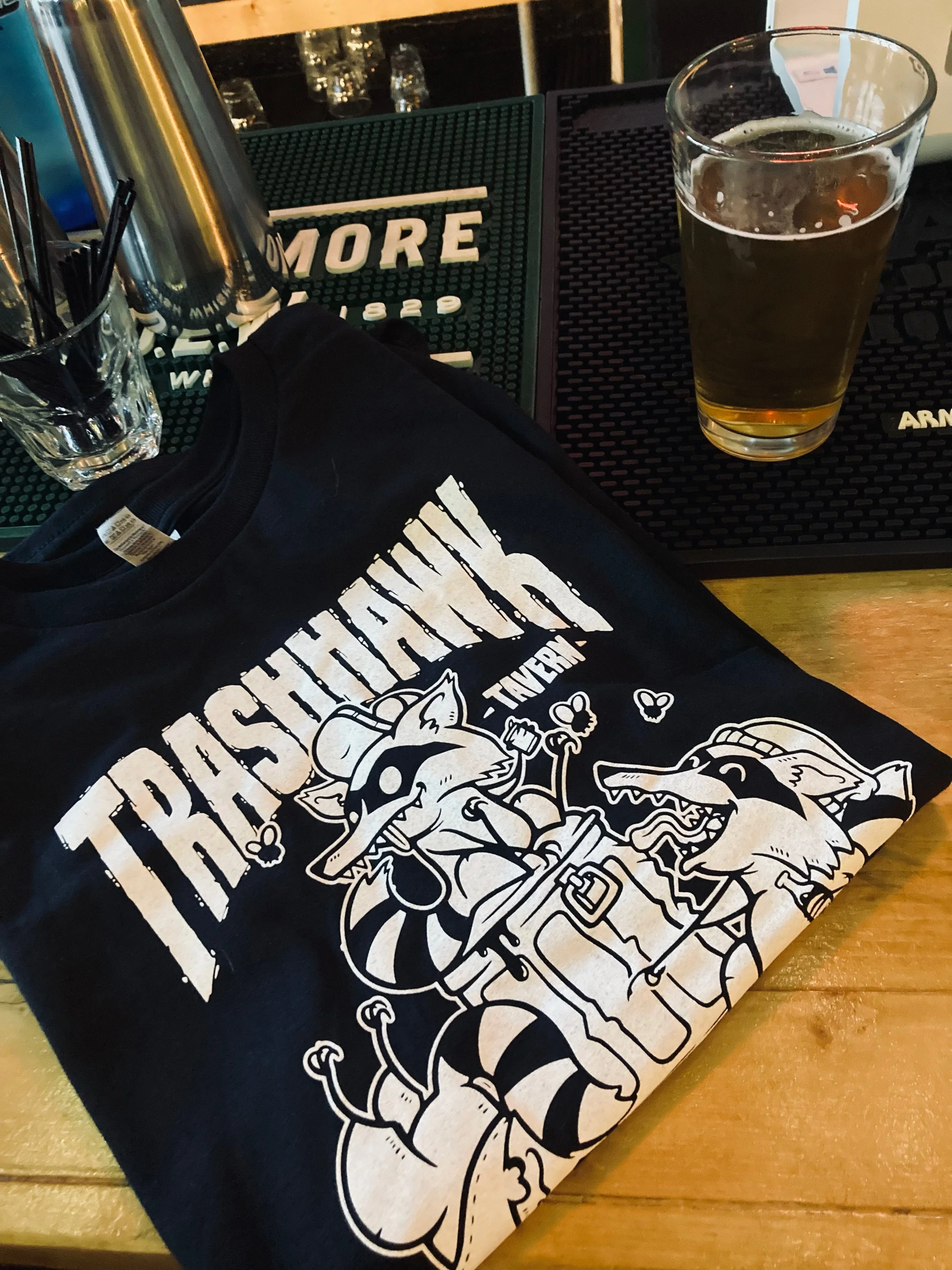 In spring 2024, I designed a T-shirt for one of my favorite bars, TrashHawk Tavern, a South Broadway dive that’s proudly adopted the raccoon as its unofficial mascot. While waiting for a friend out back, I sketched an idea and sent it to their Instagram. They loved it. After a few tweaks, the final design was born, and I used it to help evolve their branding.